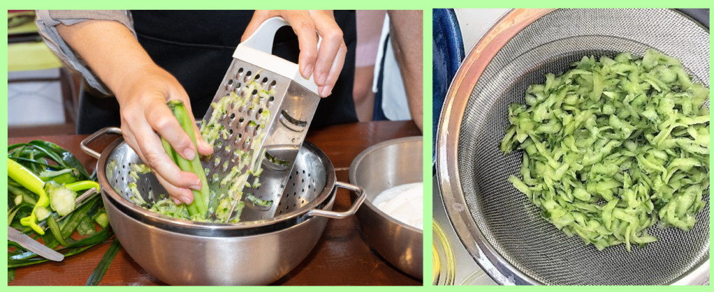 Remove the skin and the seeds (if any) of the cucumber and grate it into a colander (use the large holes of your box grater).